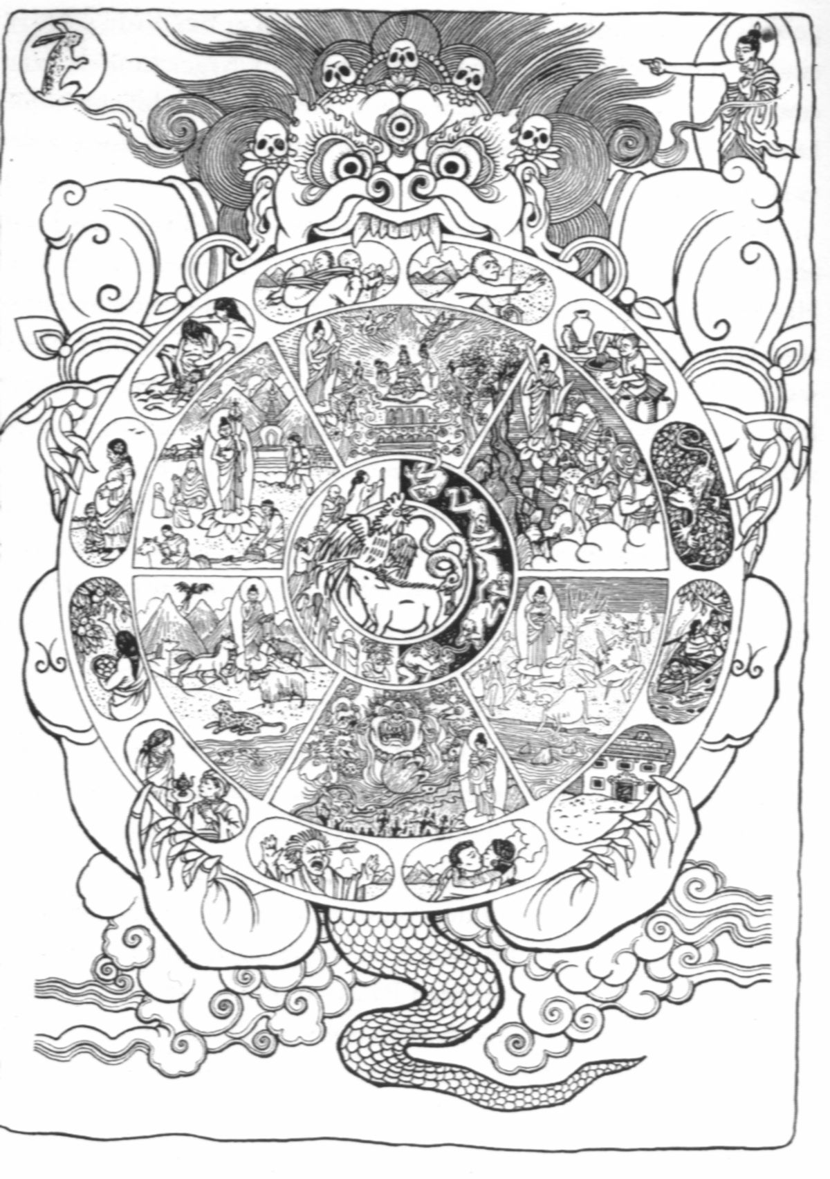 Diese erklärt: „Die eine Hälfte dieses Kreisringes ist schwarz, die andere weiß. In der schwarzen Hälfte sind Leute abgebildet, die fallen herunter, manche sind nackt. Und in der weißen Hälfte befinden sich ordentlich gekleidete Leute, die steigen aufwärts. Soll ich auch sagen, was es bedeutet?” Und da Taracitta zustimmend nickt, fährt Aruni fort: „Das heißt, dass wenn wir üble Sachen machen, dass wir dann absteigen, dass es uns dann schlechter geht, aber wenn wir gute Dinge tun, dann steigen wir auf, bekommen Anerkennung!”