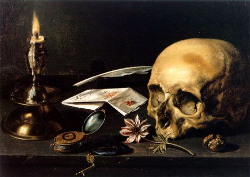 Nun weiß ich inzwischen nicht nur was vanitas ist, nämlich Vergänglichkeit, sondern ich weiß auch mehr über den Vanitas-Gedanken, denn dass war ja der Begriff, den der deva verwendet hatte, also recherchierte ich danach. Der Vanitas-Gedanke befasst sich natürlich mit Vergänglichkeit, und er ist ein beliebtes Kunstmotiv, vor allem in der Malerei. Totenschädel, welkende Blumen, verrottendes Obst und erloschene Kerzen (!) sind einige der wichtigsten Motive bildnerischer Kompositionen des Vanitas-Gedankens.