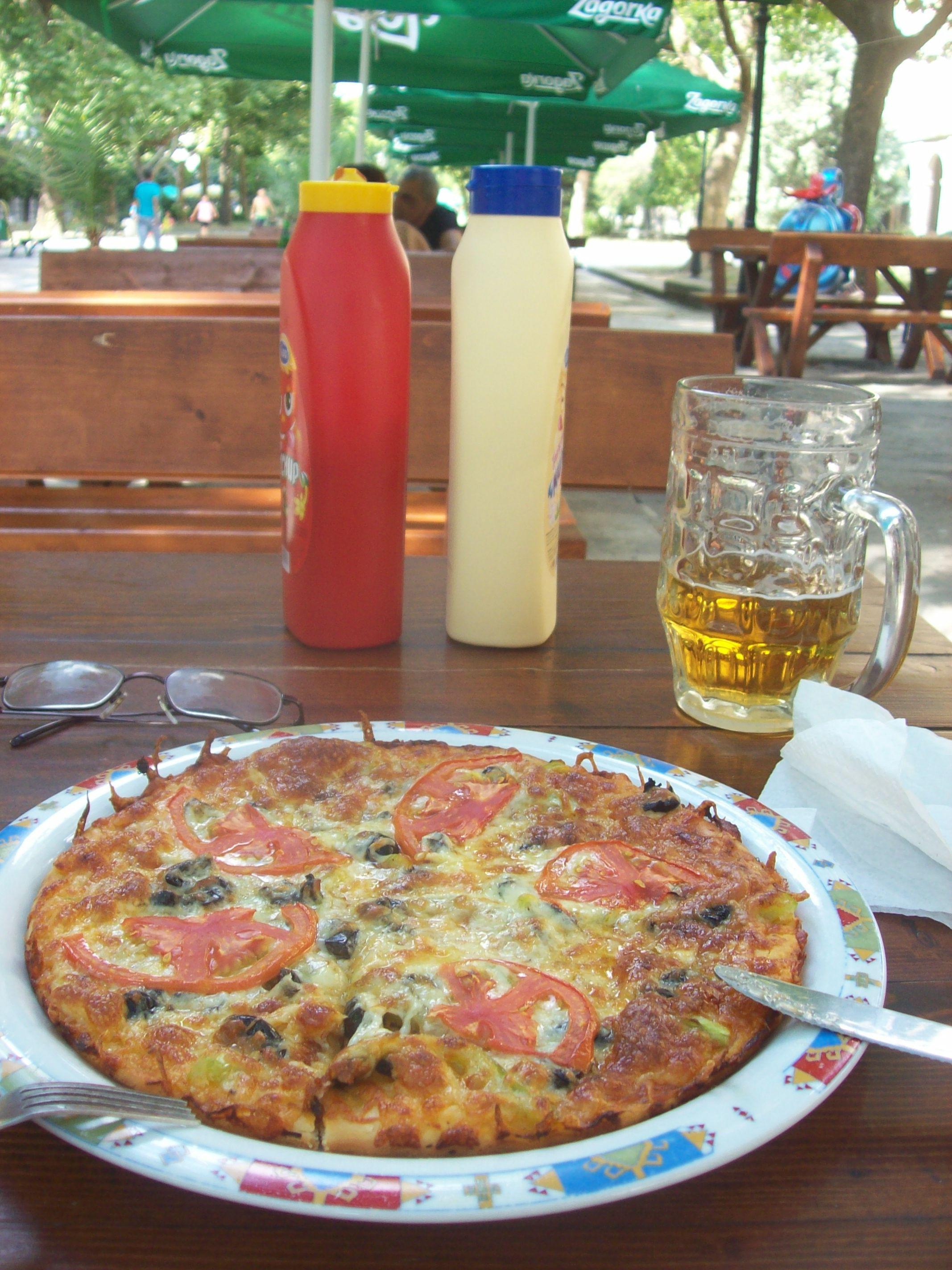Himmel, ist da Leben schön! So glücklich bin ich noch nie mit meinem süßen kleinen Auto gefahren wie heute, als wir nach Dimitrovgrad zurückkehrten. Am Abend feierte ich das Wiedererscheinen des Hinyana in einem der zahlreichen Dimitrovgrader Biergärten mit einer Pizza für 2,80 lv und einem frisch gezapften Bier für 1,20 lv... ... in der städtischen wlan-Internet- Zone der Stadt Dimitrovgrad in einem der schönen Parks. Das Leben ist schön!