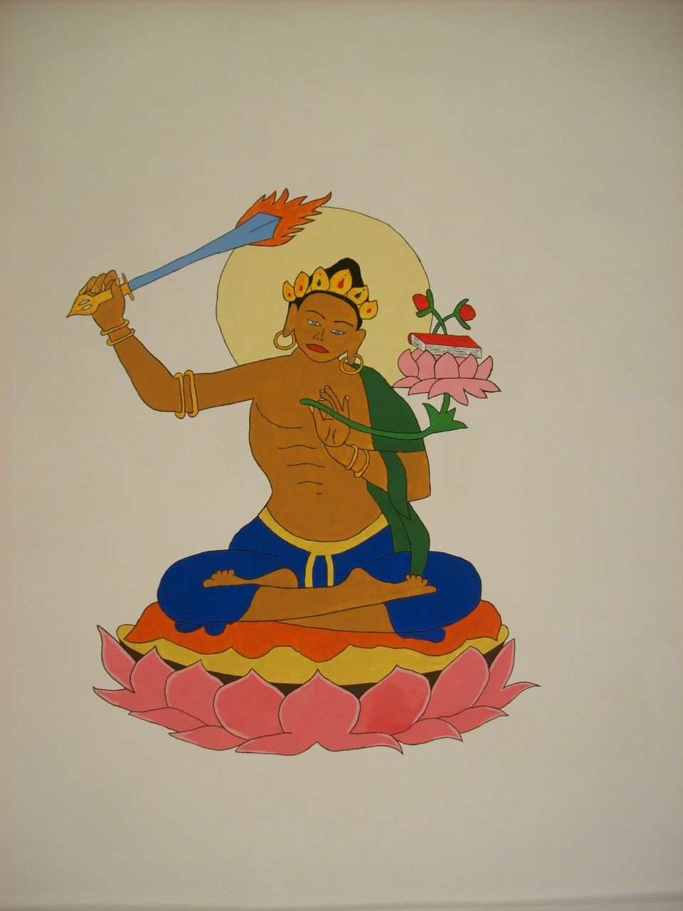 Manche Menschen sagen, der Buddhismus sei keine Religion, sondern eine Weisheitslehre, er sei die Lehre der Vernunft. Soweit würde ich nicht gehen, aber es ist richtig, dass die Vernunft eine zentrale Rolle im Buddhismus spielt, was für Religionen eher untypisch ist. Diese Rolle der Vernunft und des scharfen analytischen Verstandes wird in manchen buddhistischen Traditionen durch die Figur des Manjusri dargestellt. Manjusri wird mit dem flammenden Schwert der Transformation dargestellt, wobei das scharfe Schwert die Geisteschärfe symbolisiert; die Flammen der Transformation symbolisieren die läuternde Kraft der Ethik auf dem spirituellen Pfad. Wir haben das Bild Manjusris bei uns in Gelnhausen im Meditationsraum am Obermarkt groß an der Wand abgebildet.