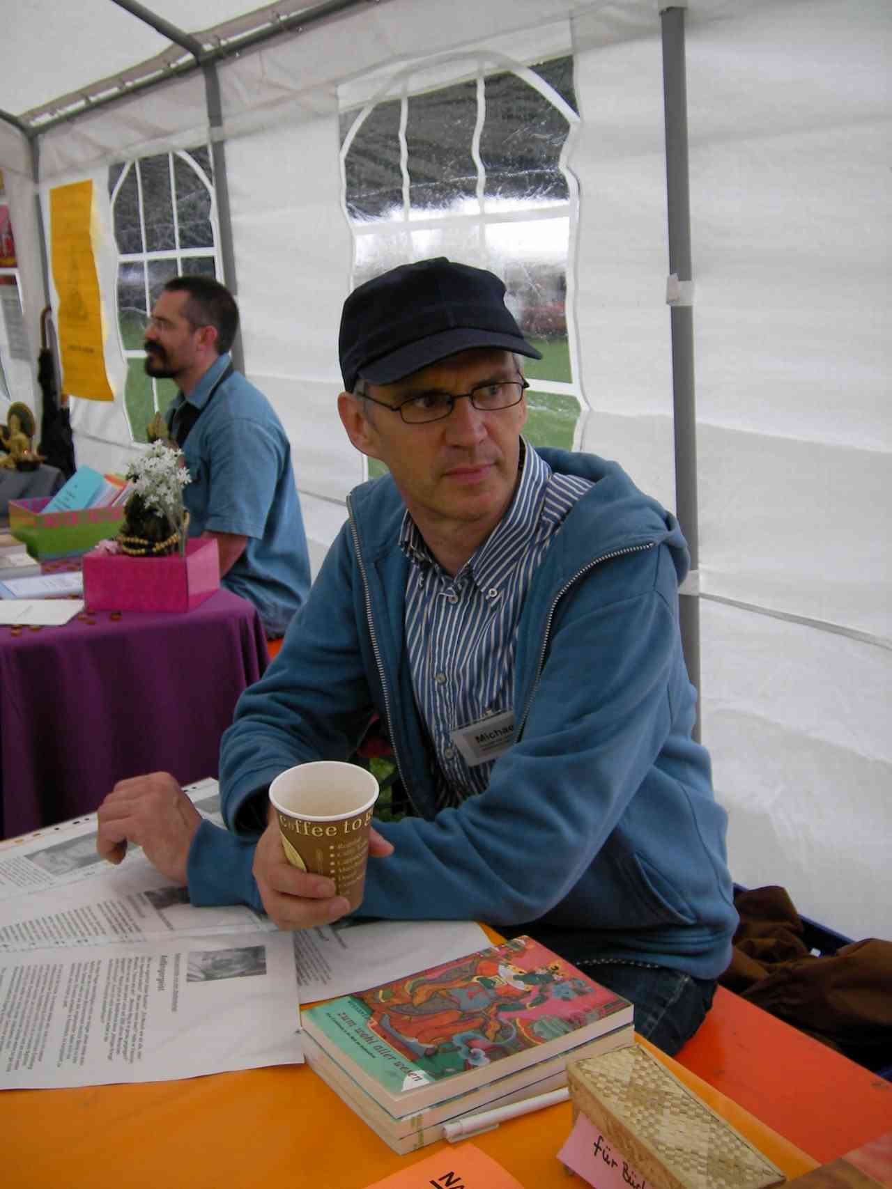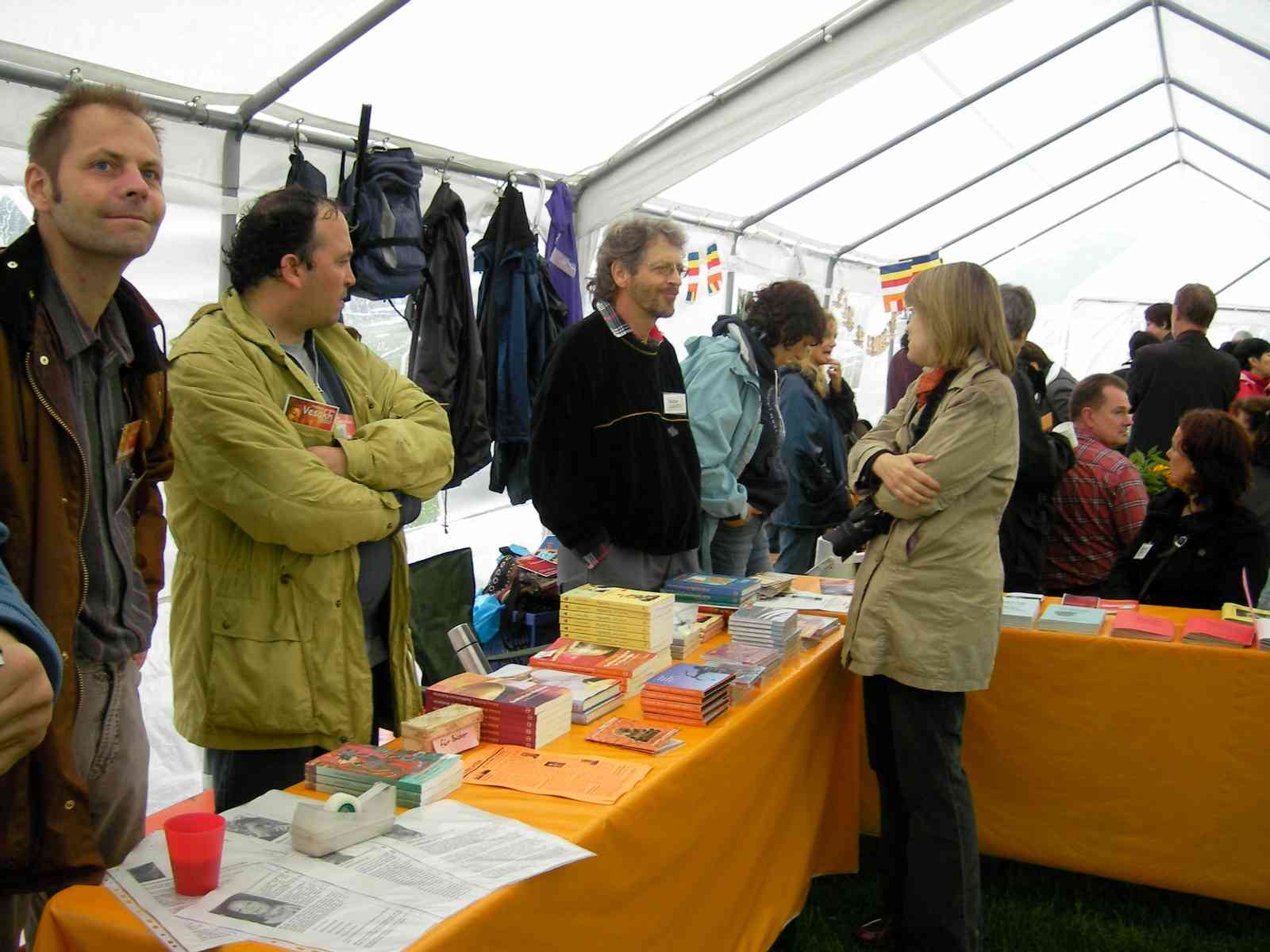 Unser Bücherstand. In der Mitte Dierk, rechts Stefan. Informationstafel des