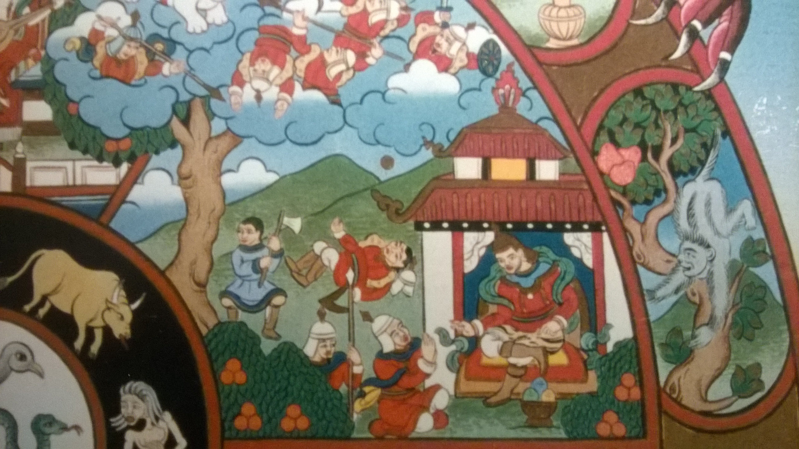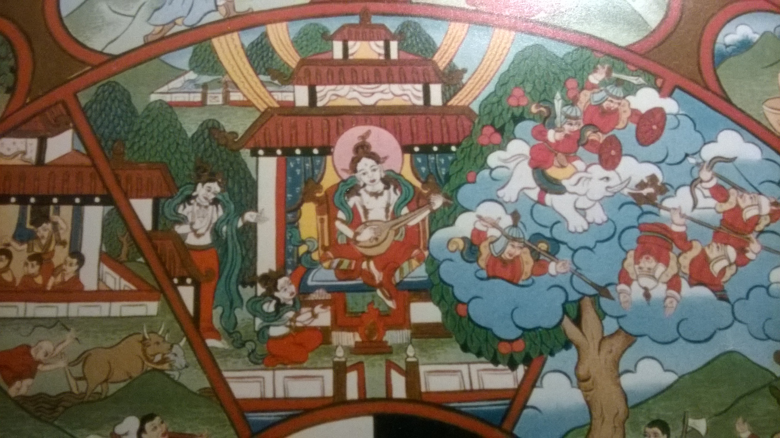 Und dieser Neid ist es, der die asuras zum Kampf reizt. Im linken Teil des asura-Feldes sehen wir einen Baum wachsen, der über die Begrenzung dieses Feldes herauswächst und ins Feld der devas hinein, woraus man folgern kann, dass die devas die Früchte dieses Baumes genießen können, der auf dem Boden der asuras wächst. Diese sind daher sehr wütend und fordern die Götter zum Kampf heraus. Das Ganze erinnert mich etwas an Klassenkampf, traditionell wird dieser Baum jedoch als Wünsche erfüllender Baum gesehen – allerdings wachsen die wunscherfüllenden Früchte nur im Segment der devas. Die asuras sind darüber so wütend, dass sie versuchen, den Baum zu fällen, weil sie den devas die Früchte neiden. Allerdings wird ein gefällter Baum keine Früchte mehr tragen, auch nicht für die asuras, diese verfolgen also aus Wut und Neid eine nicht nachhaltige Strategie – und damit kommt auch das Element der Verblendung hinein.