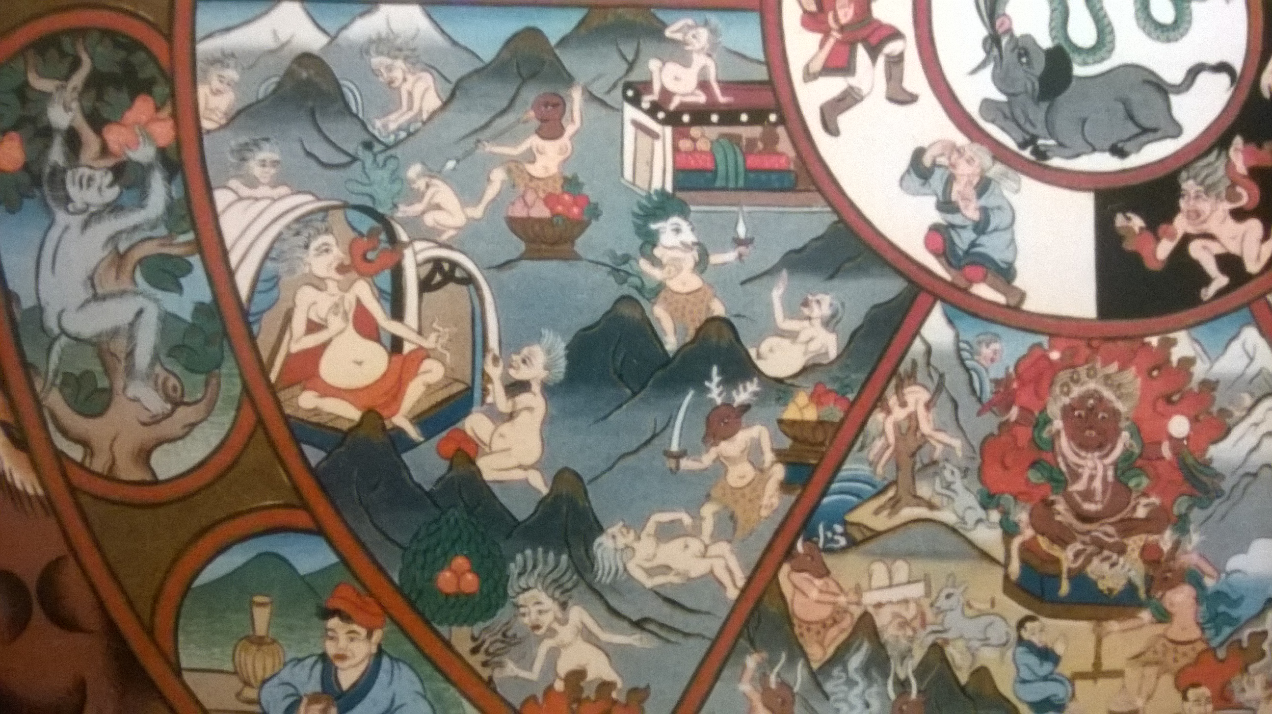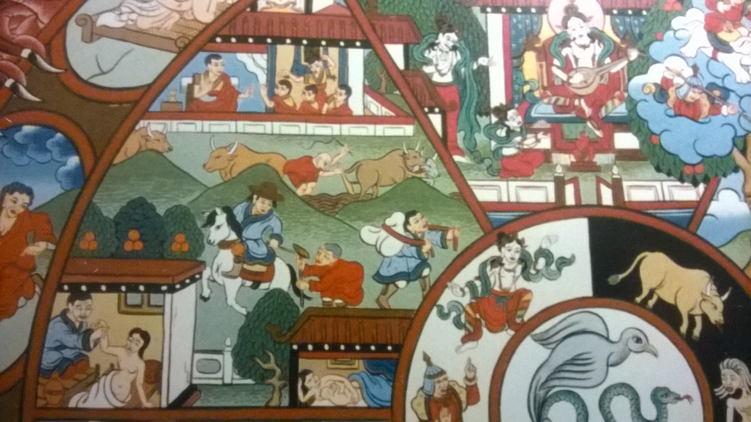 In der Menschenwelt – in der Welt der wahren Menschen – also dann, wenn wir in keiner der anderen geistigen Verfassungen weilen, finden wir ein recht ausgewogenes Verhältnis vor. In dem Bild sehen wir unten links ein Paar beim Liebesspiel, rechts eine Mutter mit Baby, in der Bildmitte einen Mann in der Blüte seines Lebens zu Pferde, daneben eine alte und gebeugte Person und rechts davon das Lebensende, dargestellt durch eine Leiche in einem Bündel, das zum Leichenacker getragen wird. Und darüber etwas, das hilfreich für die spirituelle Entwicklung ist: eine Klosterschule, in welcher der Dharma gelehrt wird.