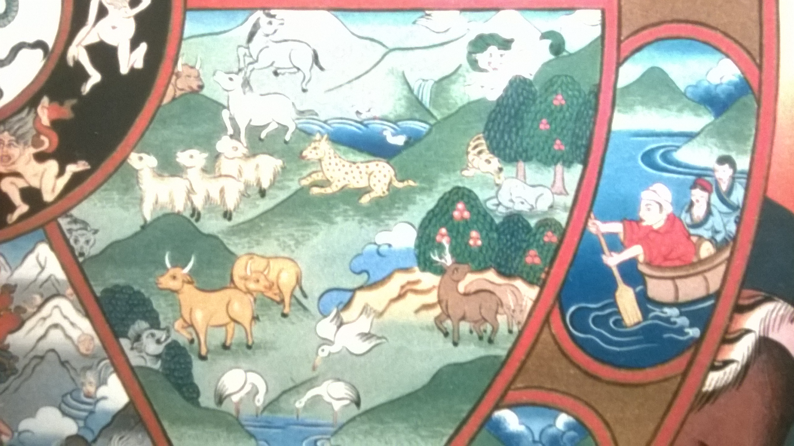 Und was bringt der Buddha in die Tierwelt? Vielleicht erstaunt es uns, wenn wir sehen, was er den Tieren zeigt: ein Buch! Aber wir erinnern uns: es geht ja nicht um wirkliche Tiere, sondern um uns, wenn wir unseren animalischen Gelüsten folgen. Der Buddha bringt den im Hedonismus Verirrten Bildung, er bringt Kultur. Wenn wir uns bilden, uns mit den Künsten, der Literatur und den Wissenschaften beschäftigen, dann verfeinert sich unser Geist allmählich. Was der Buddha uns anbietet, ist Bildung und Sozialisation. Nicht umsonst gehört zu jeder sinnvollen Entwicklungspolitik, den Analphabetismus zu beseitigen, den Menschen die Buchstaben und das Buch zubringen.