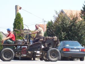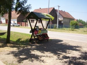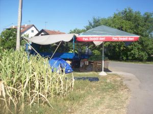 Wie überall finden sich auch hier Melonenverkäufer, dieser am Rande von Slavonski Brod campiert sogar bei seinem Stand, die Toilette: ein Maisfeld. Ich