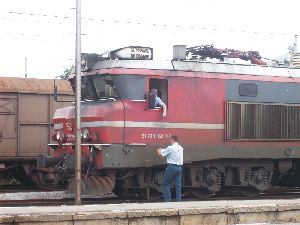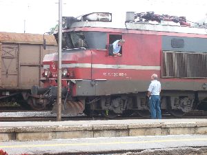Zug kommt, um sich beim Lokführer zu erkundigen.
