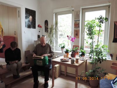 Die ersten Gäste sind eingetroffen und begutachten die Lektüre im Leseraum.