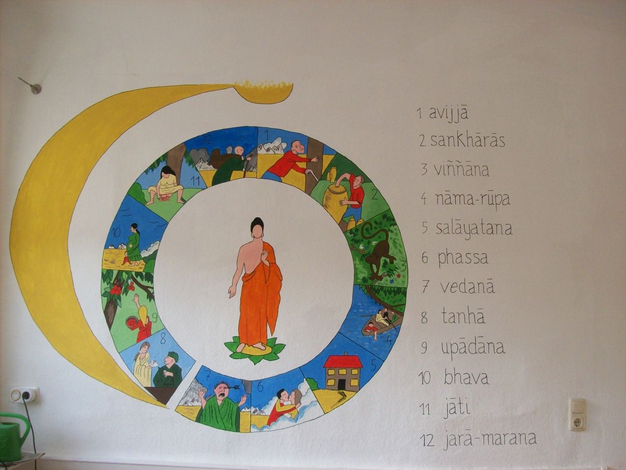 Im Lebensrad kommt in der Darstellung des paticca samuppada, also im äußeren der vier konzentrischen Ringe, in dem Ring, der hier links an der Wand dargestellt ist, Geburt, jati, an elfter Stelle vor.Es gibt insgesamt drei verschiedene Ansätze, wie man Wiedergeburt im Lebensrad interpretieren kann. Nach der traditionellen Lehrweise werden wir in sechs verschiedenen Bereichen (oder Welten) wiedergeboren, das sind die Menschenwelt, die Tierwelt, die Götterwelt, der Bereich der Titanen, die Höllenwelt und der Bereich der hungrigen Geister. Das ist die traditionell in Asien häufigste Interpretation.
